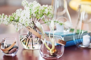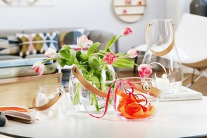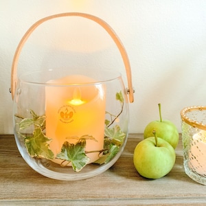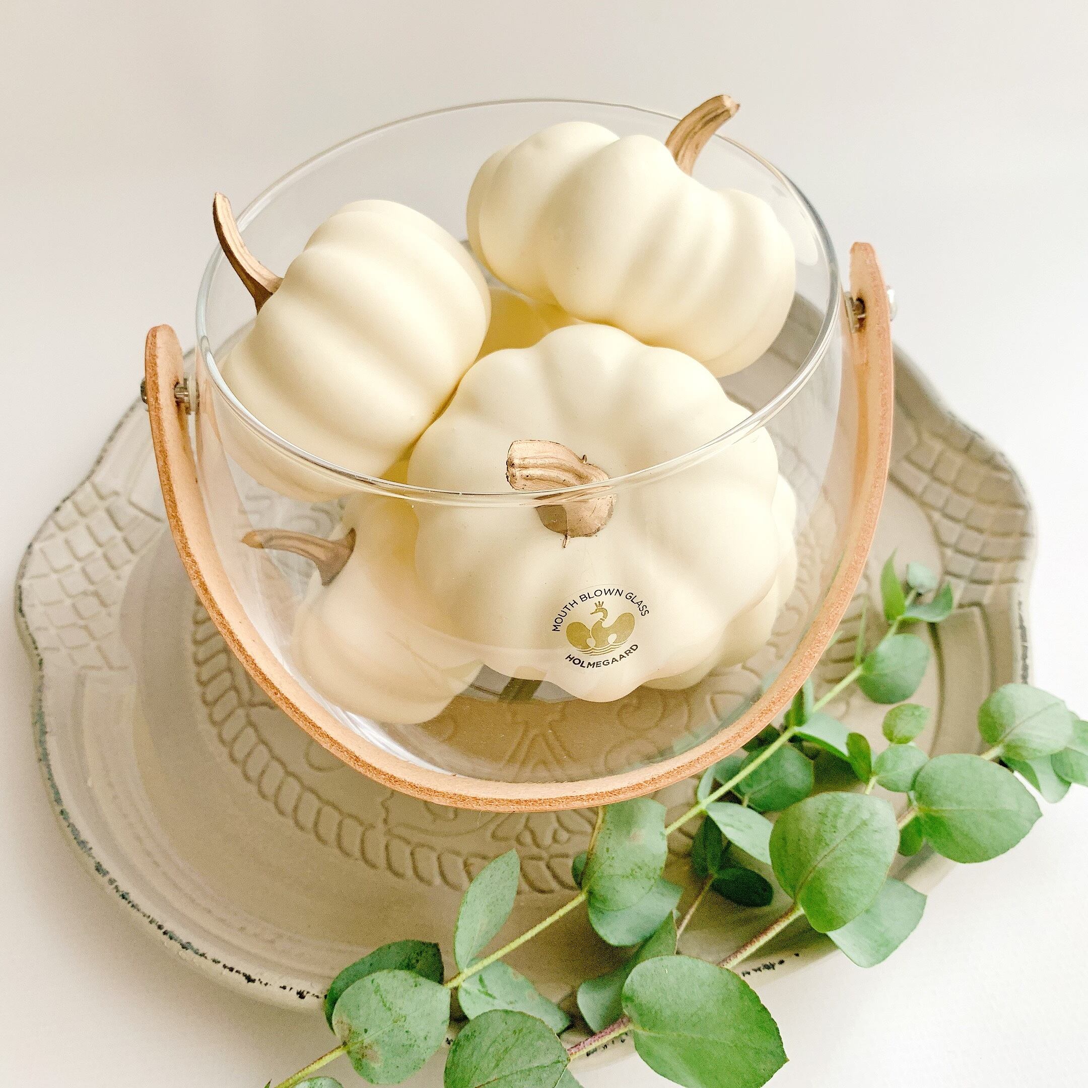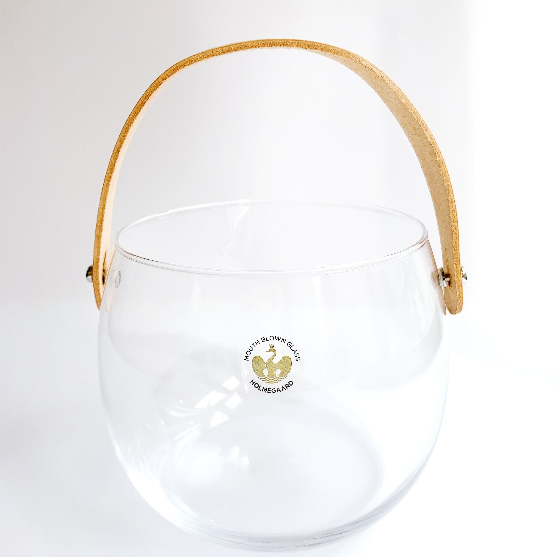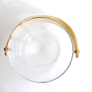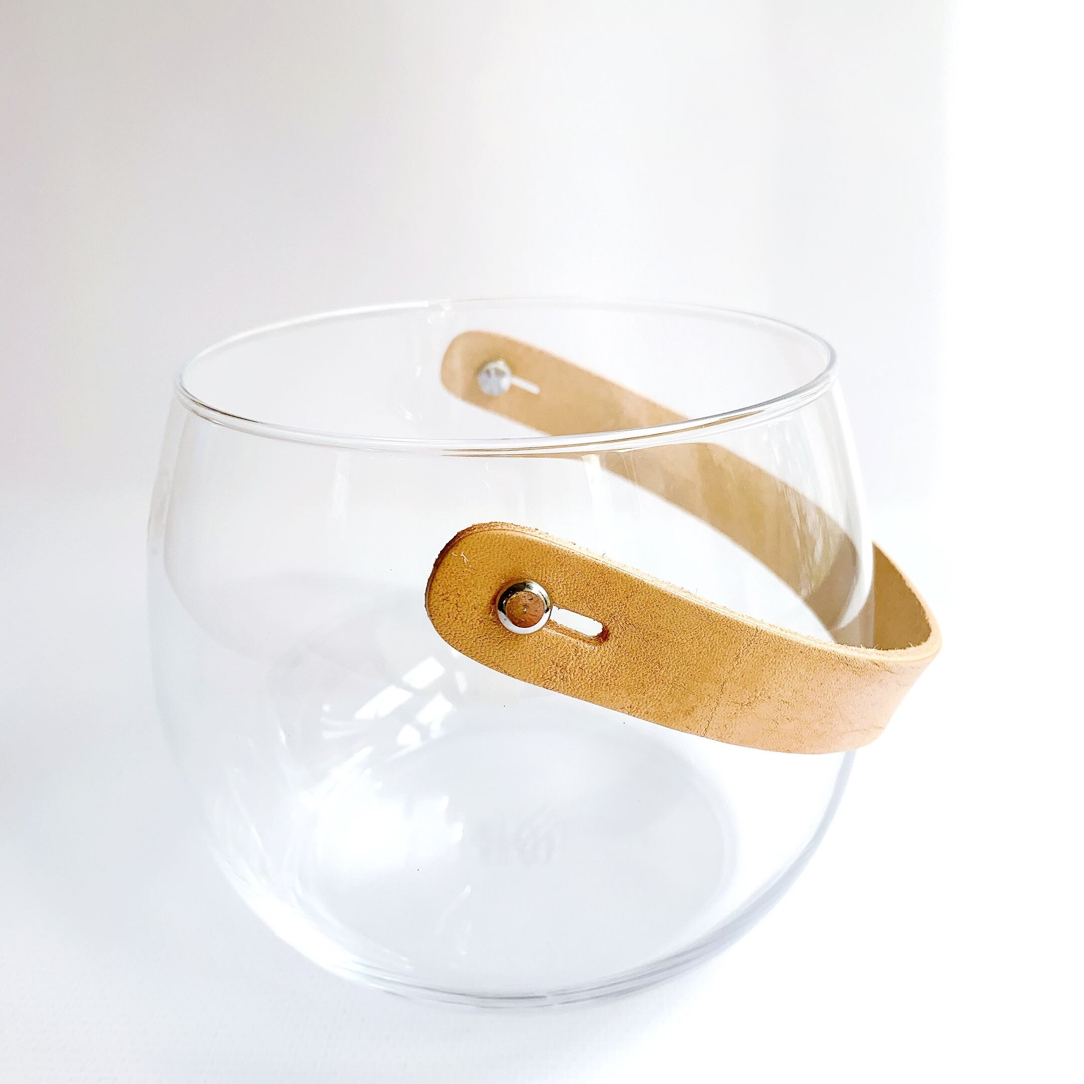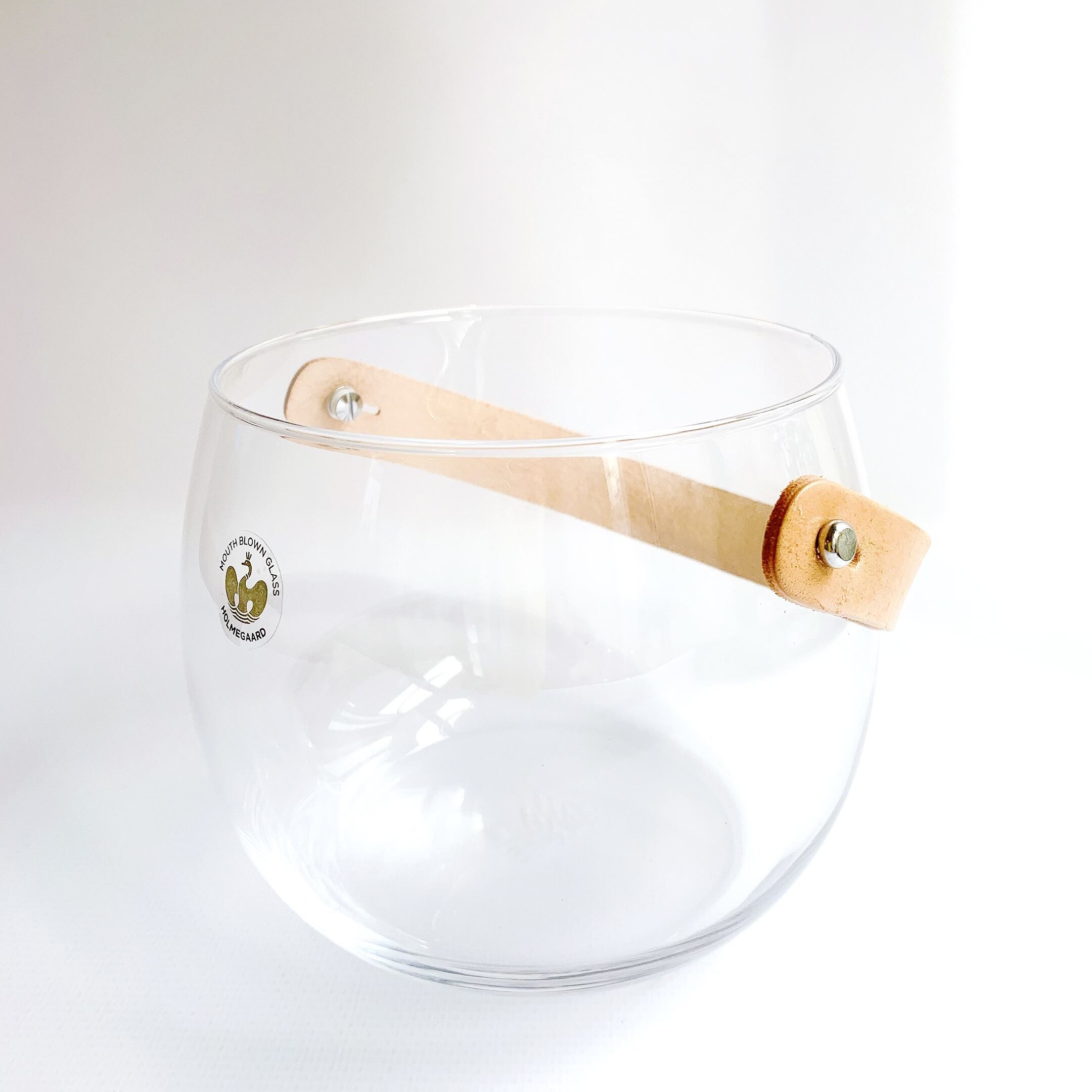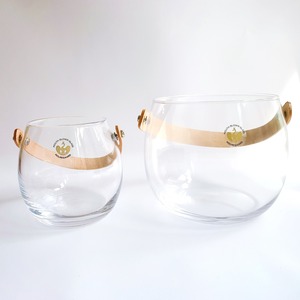 ボトルからインスパイアされたガラス製のボウル型のフォルムに、天然皮革のキャリーストラップを取り付け、カジュアルな中に上品な印象を醸し出しています。